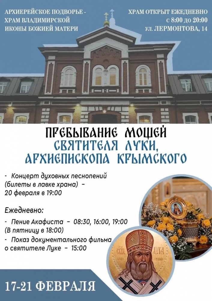Мощи святителя Луки Крымского будут находиться в храме Владимирской иконы Божьей Матери Саратова с 17 по 21 февраля.